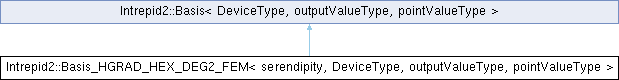 When the serendipity template argument is true, the basis has cardinality 20 and spans an INCOMPLETE tri-quadratic polynomial space (Dofs are associated only to vertices and edges). Note, Basis_HGRAD_HEX_I2_FEM = Basis_HGRAD_HEX_DEG2_FEM<true>