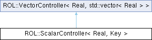 Inheritance diagram for ROL::ScalarController< Real, Key >:Public Member Functions | |