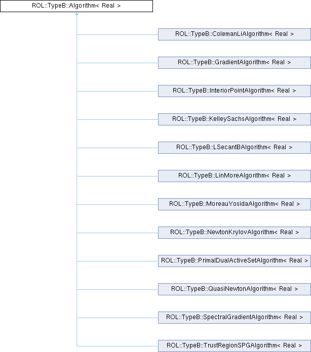 Inheritance diagram for ROL::TypeB::Algorithm< Real >:Public Member Functions | |